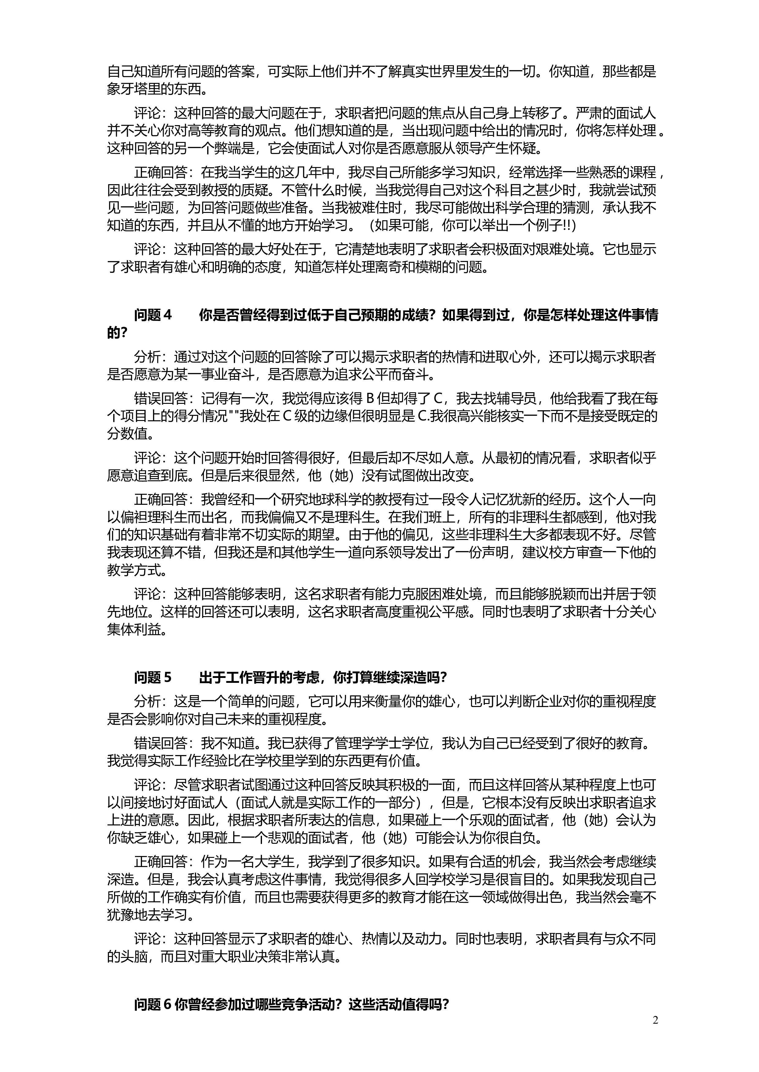 世界五百强面试题目及应答评点问题1你为什么觉得自己能够在这个职位上取得成就?分析:这是一个相当宽泛的问题,它给求职者提供了一个机会,可以让求职者表明自己的热情和挑战欲。对这个问题的回答将为面试人在判断求职者是否对这个职位有足够的动力和自信心方面提供关键信息。错误回答:我不知道。我擅长做很多事情。如果我能得到并且决定接受这份工作,我确信自己可以把它做得相当好,因为我过去一直都很成功。评论:尽管表面上听起来这种回答可以接受,但是它在几个方面都有欠缺。首先,这种语言很无力。像モ擅长做很多事情以及相当好之类的话,都无法反映你的进取心,而如果不能表现出足够的进取心,你就很难进入最好的企业。另外,将过去做...